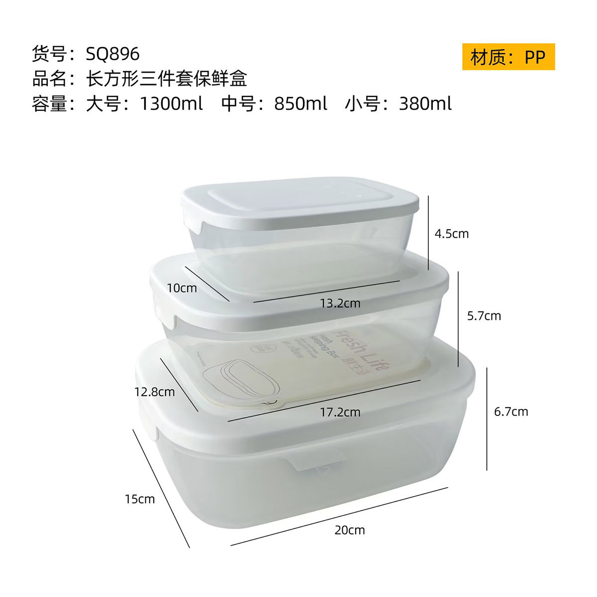 SQ-896(三件套):小號:132*100*45mm/380ml 中號:172*128*57mm/850ml 大號:200*150*67mm/1300ml