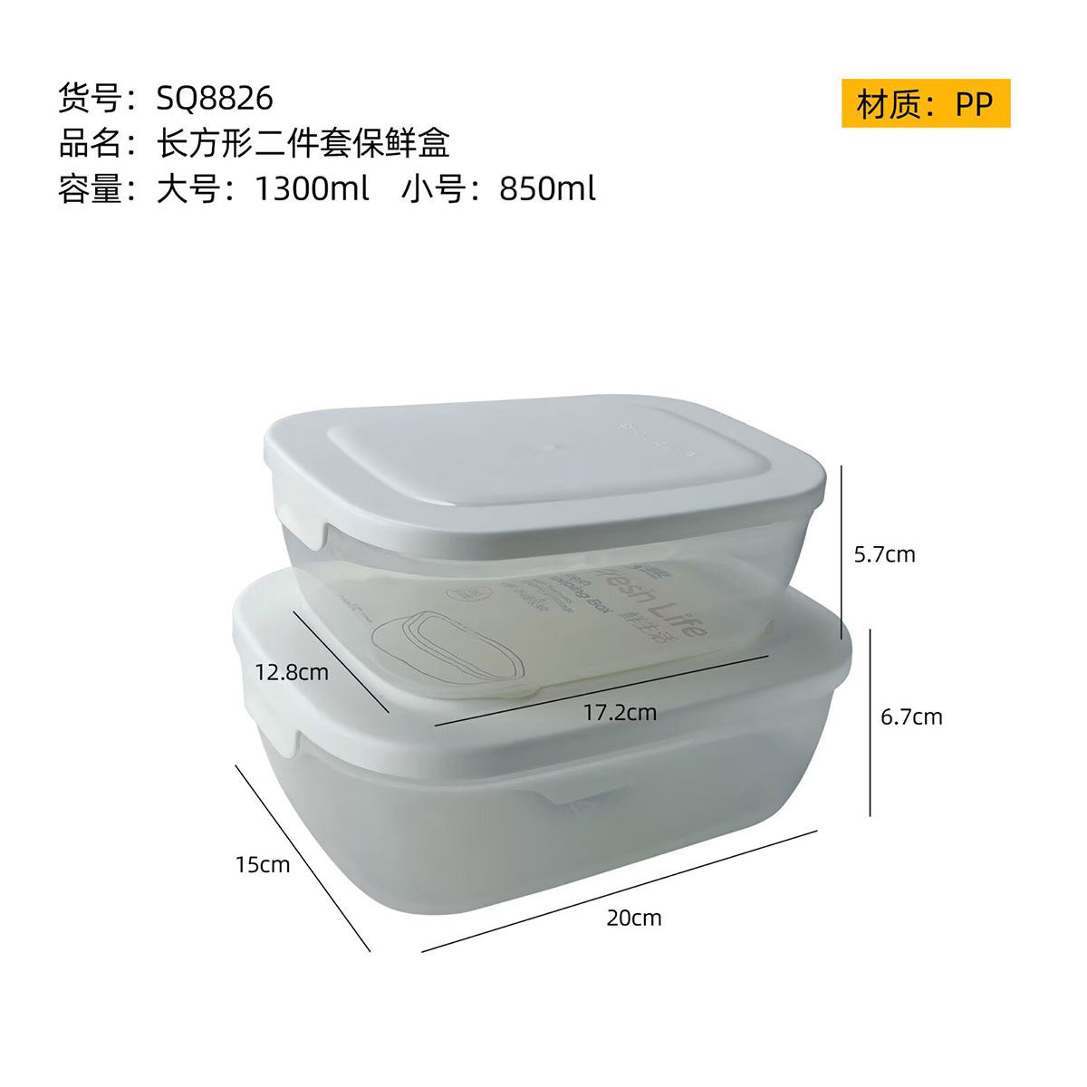 Size: SQ-8826(二件套):中號:172*128*57mm/850ml 大號:200*150*67mm/1300ml