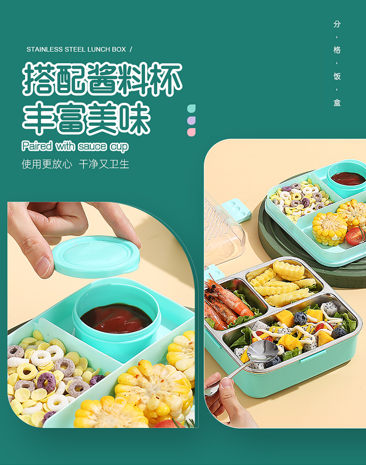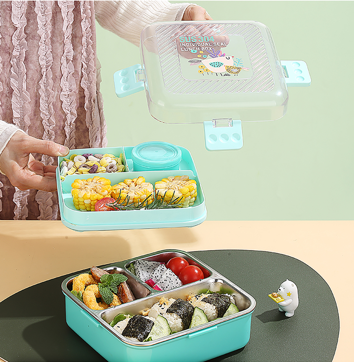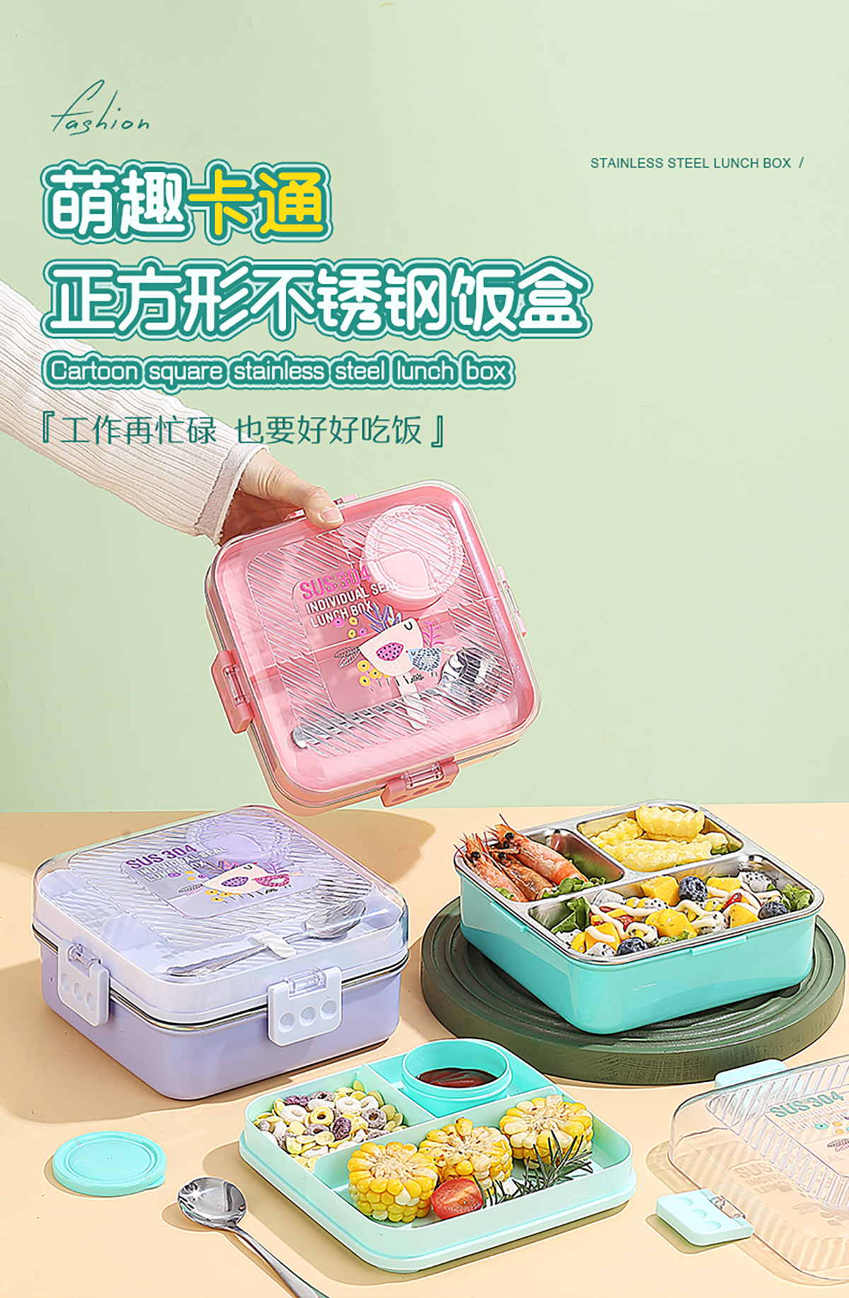 卡通正方形不銹鋼飯盒1120ml+70ml