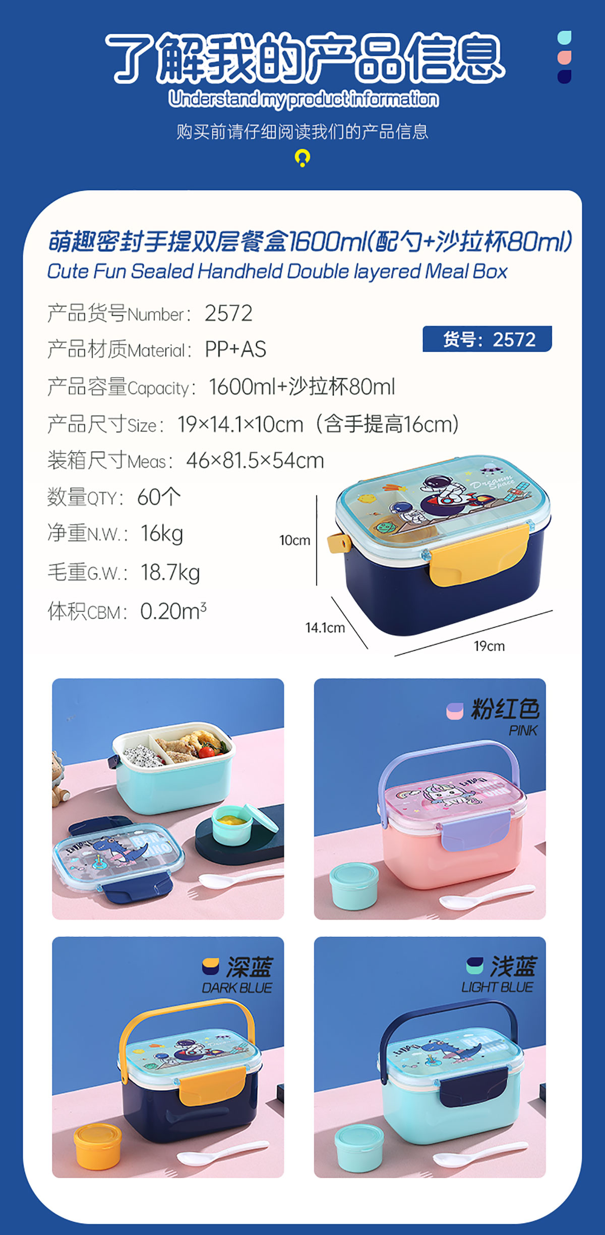 萌趣密封手提雙層餐盒(1600ml+沙拉杯80ml+PP勺子)