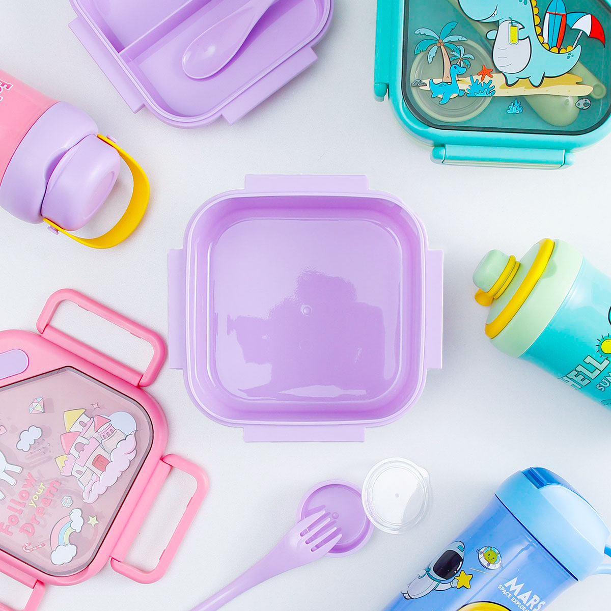 趣悅卡通正方雙層飯盒(含調料盒)+翻蓋吸嘴/旋蓋運動/翻蓋運動水壺