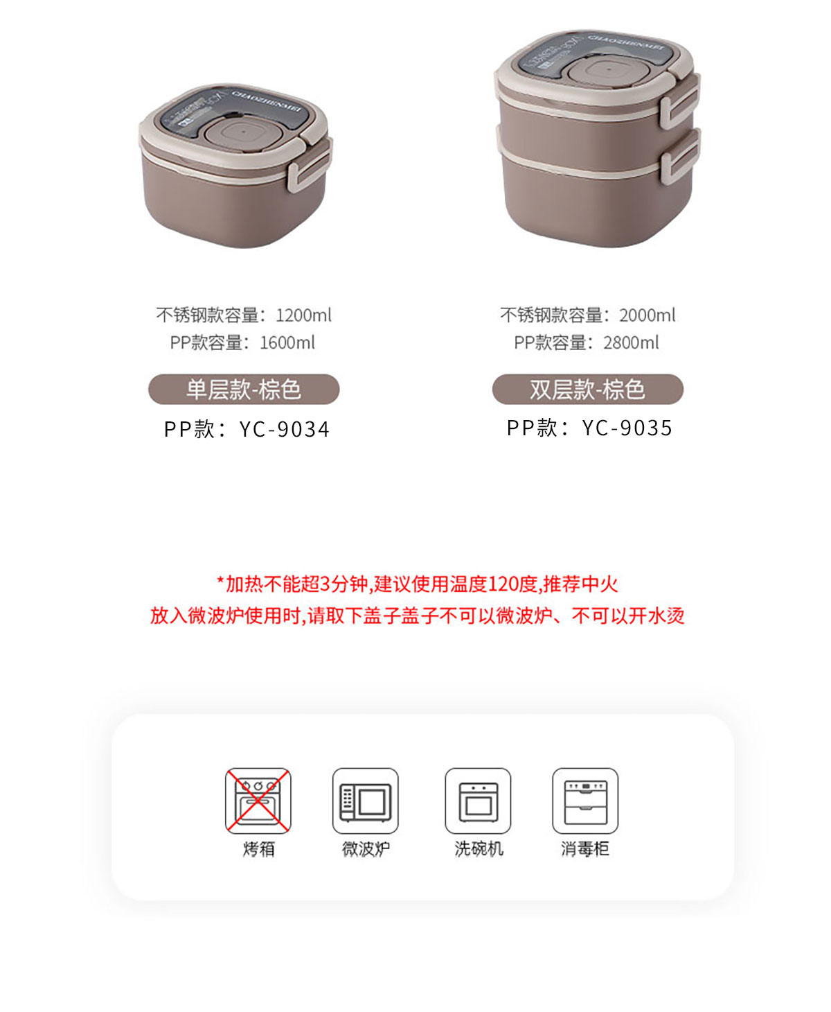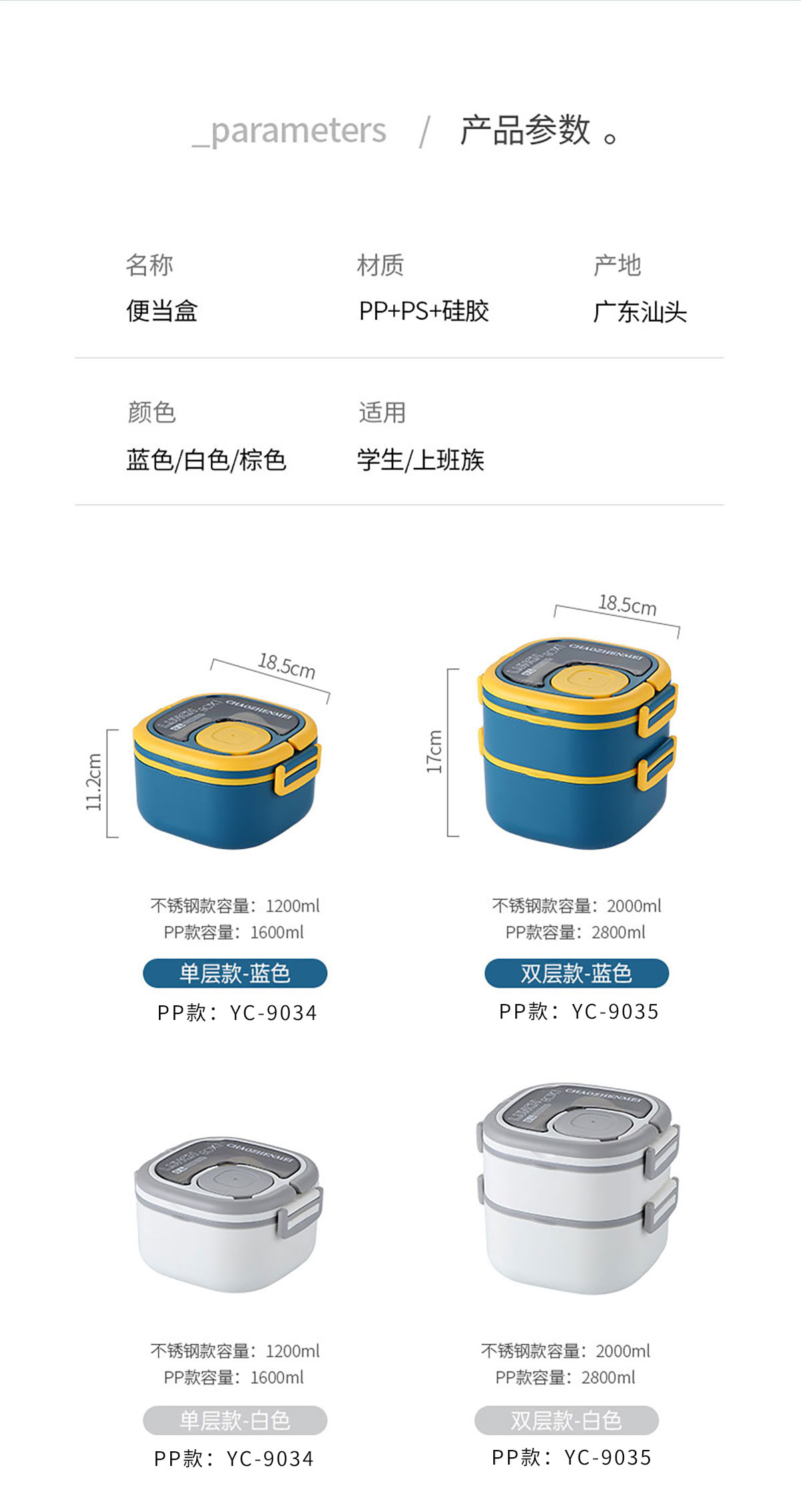 Size: YC-9034(單層):185*185*112mm/1600ml