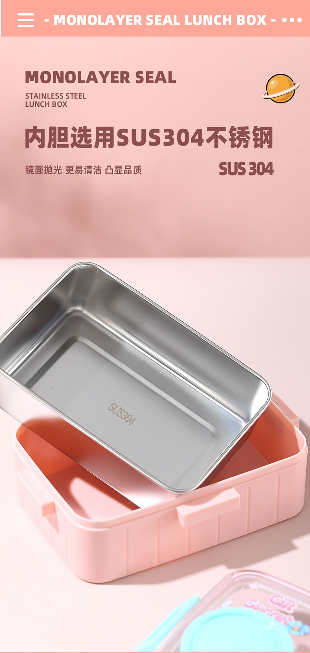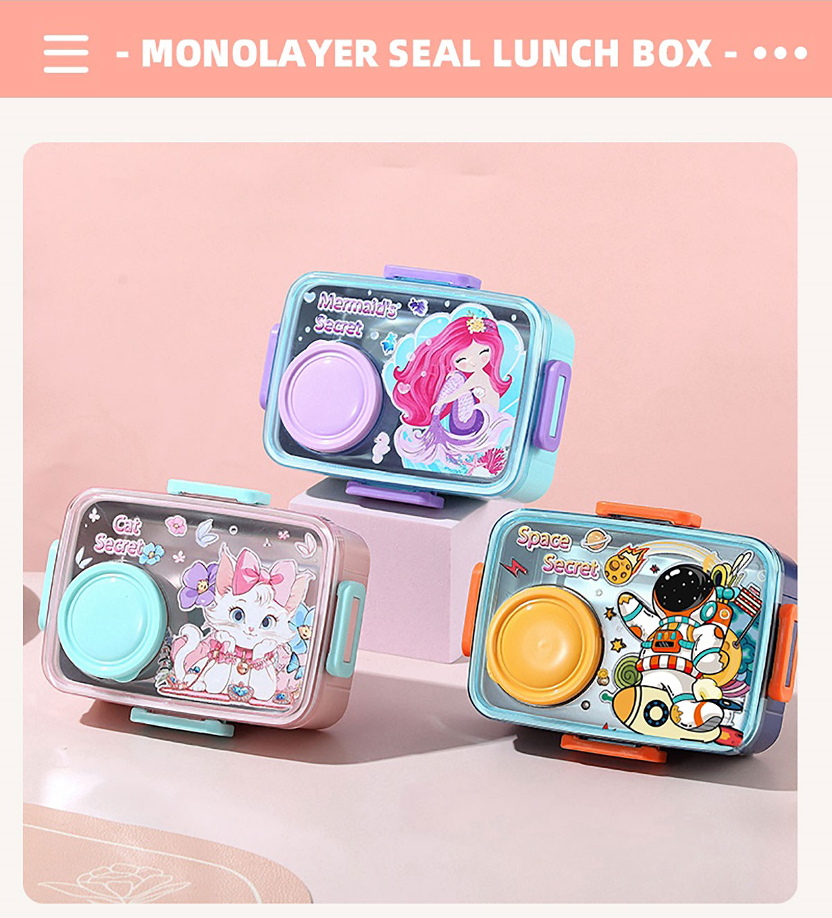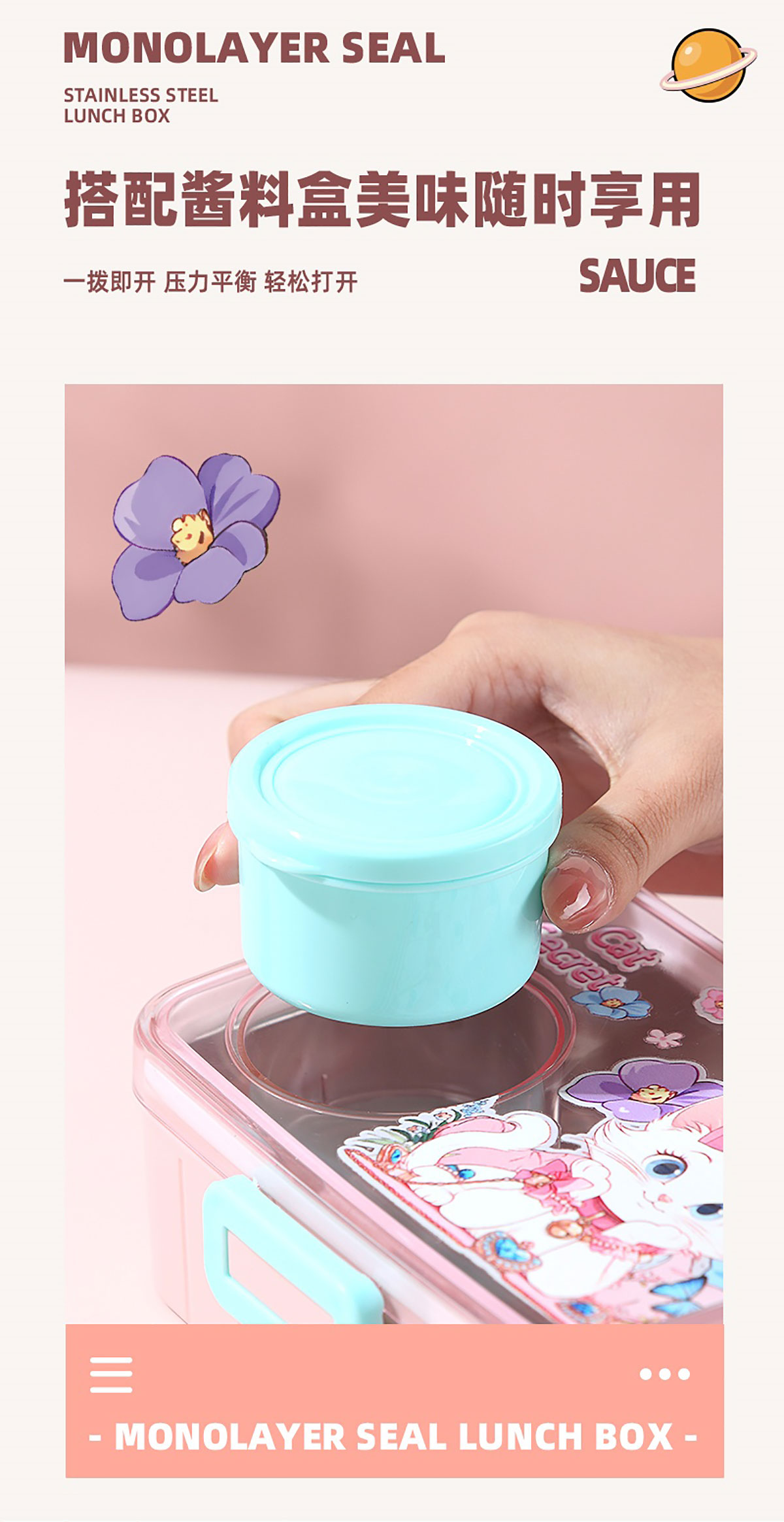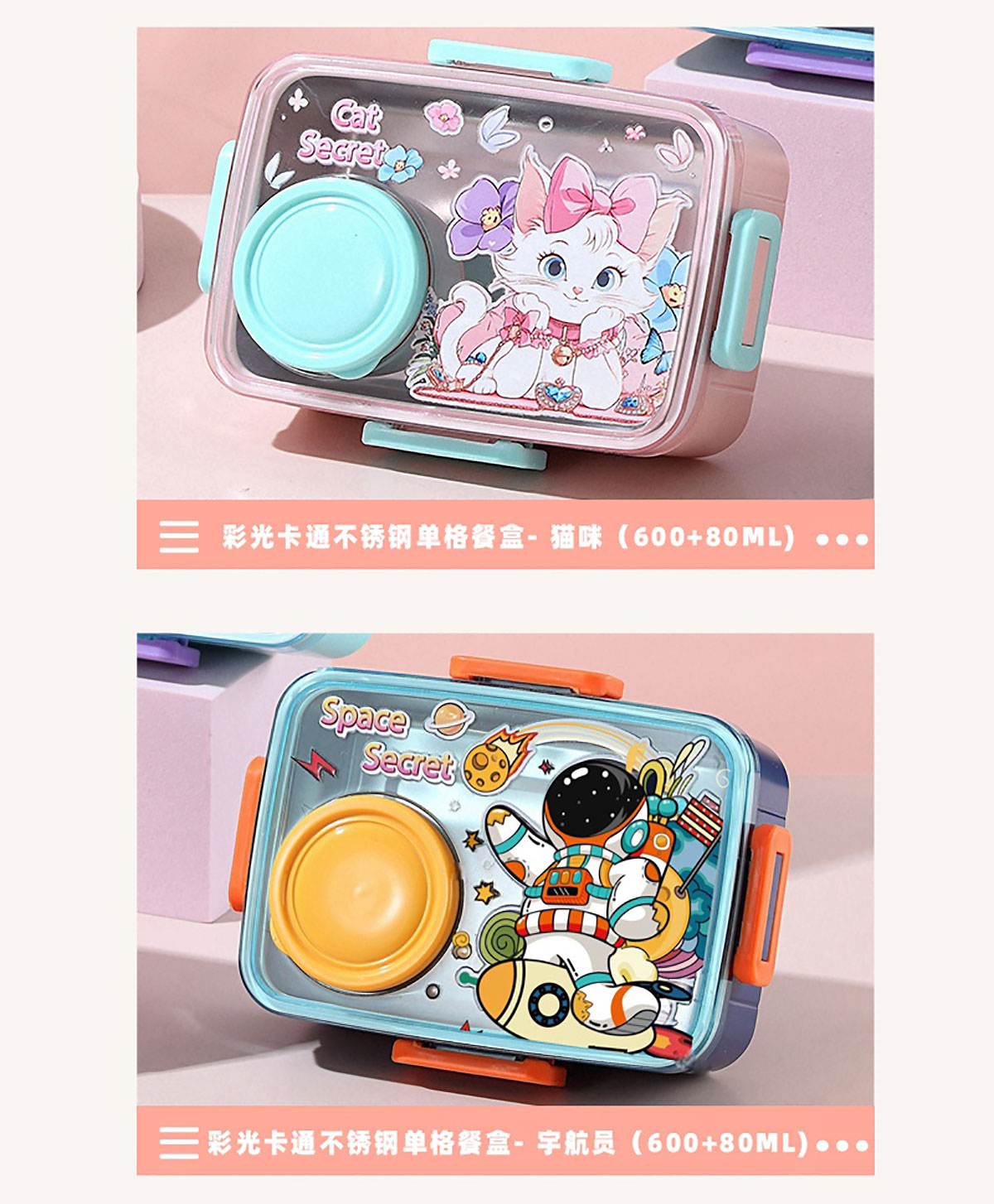 彩光卡通不銹鋼餐盒(單格600ml+外置醬料杯80ml)